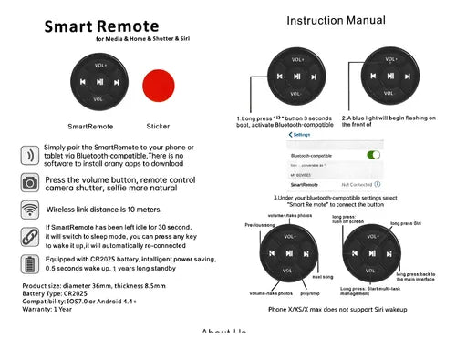 Botón multimedia inalámbrico para controlar música, llamadas, volumen, cámara y asistente de voz sin soltar el volante ni el manillar. Su diseño compacto y retroiluminado lo hace ideal para autos, motos y bicicletas, mejorando la seguridad y comodidad al conducir.