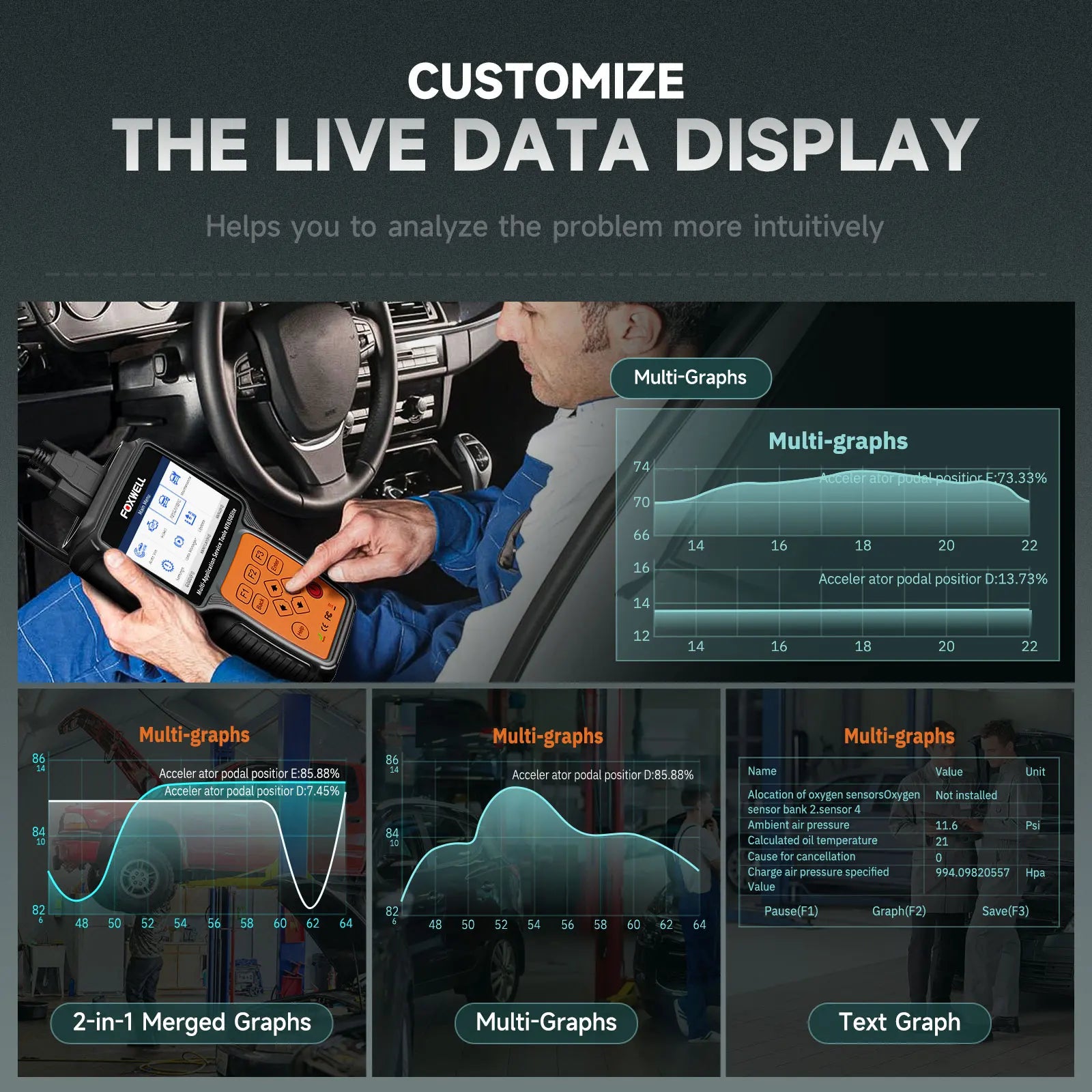 - Funciones completas OBD2: lectura/borrado de códigos, flujo de datos en vivo, fotogramas congelados, prueba de sensor O2, prueba de monitor a bordo, verificación VIN y prueba de componentes.
