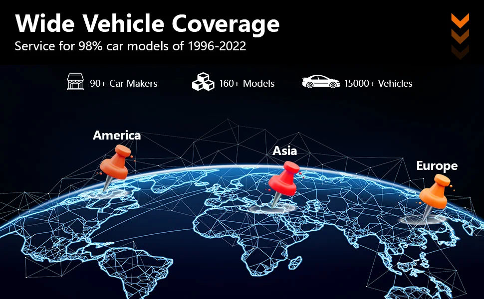 Compatible con vehículos de América, Europa y Asia, incluyendo marcas como BMW, Mercedes-Benz, Audi, Toyota, Ford, Chevrolet, Honda, Nissan, Peugeot, Renault, Hyundai, Kia, entre muchas otras (modelos 1996 – 2023).