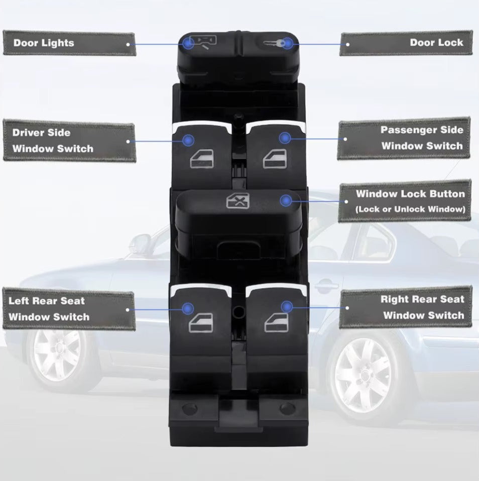 Interruptor eléctrico maestro de ventanas compatible con varios modelos Volkswagen (1998-2004).