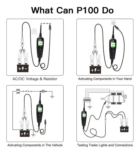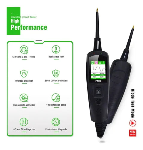 Herramienta de diagnóstico profesional para sistemas eléctricos de automóviles. Permite medir voltaje, resistencia, diodos, activar componentes y proteger contra cortocircuitos. Compatible con vehículos de 12V y 24V, ideal para talleres y uso doméstico.
