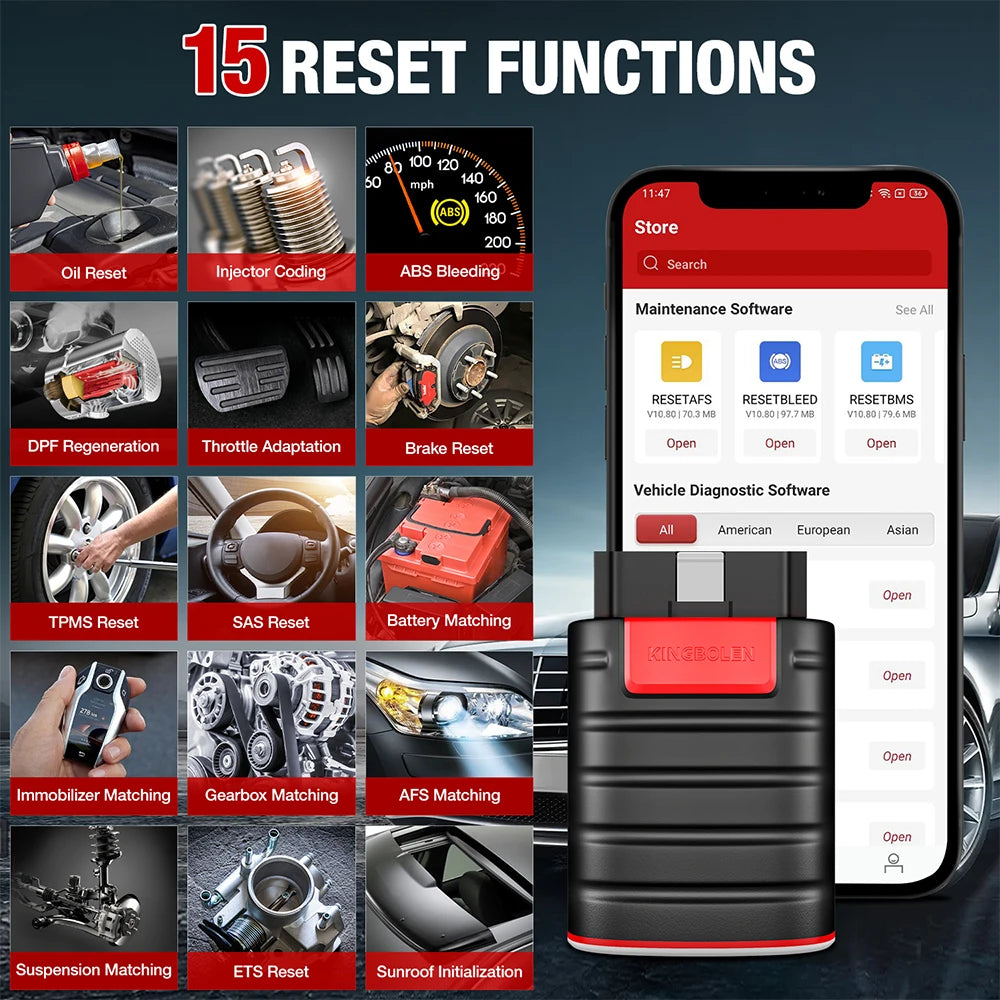 El Kingbolen Ediag es un escáner automotriz OBD2 multimarca que convierte tu smartphone en una herramienta profesional de diagnóstico. Incluye 1 año gratis de licencia completa, con acceso a más de 115 marcas de vehículos y 15 funciones especiales de reinicio, ideal para talleres, mecánicos y usuarios avanzados.