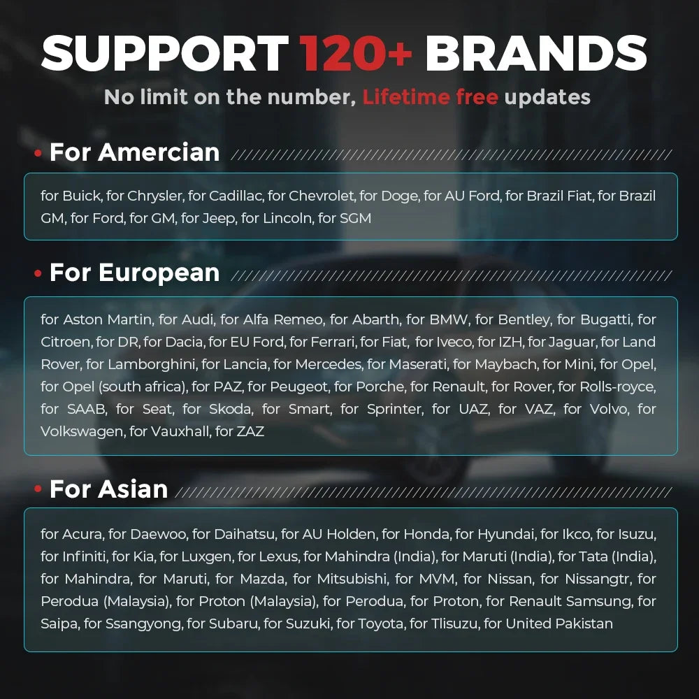 - Diagnóstico completo de todos los sistemas de por vida: motor, transmisión, ABS, SRS, TPMS, batería, inmovilizador, entre otros.