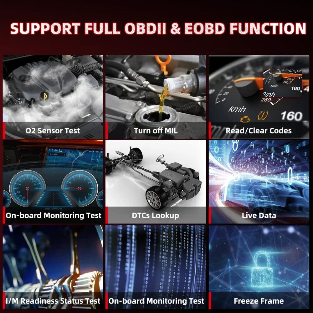 - Funciones OBD2 completas: lectura y borrado de códigos, flujo de datos en vivo, pruebas de sensores, EVAP, estado de emisiones, información del vehículo y más.