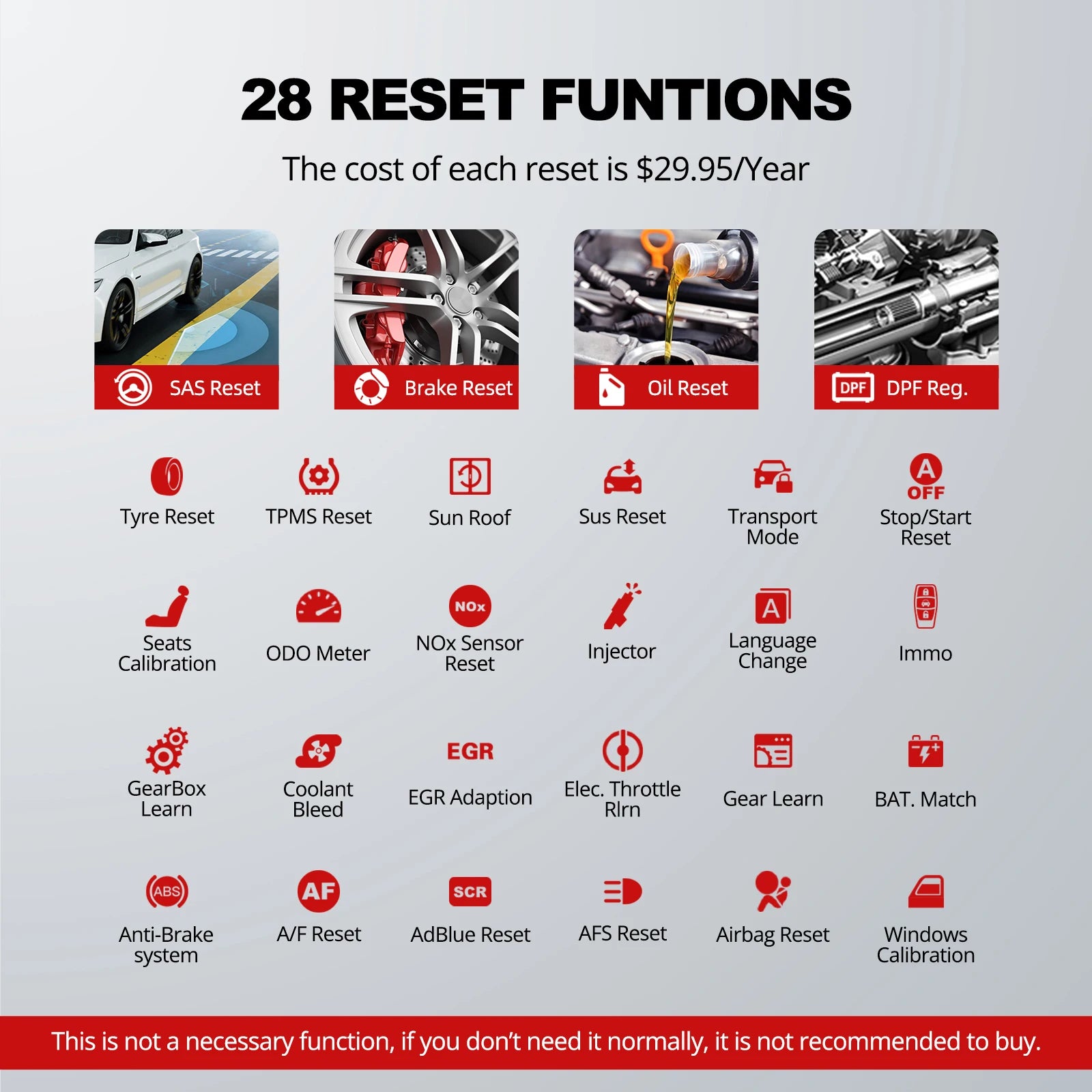 🧩 Funciones de reseteo disponibles (28 opciones, cada una $29.95/año):