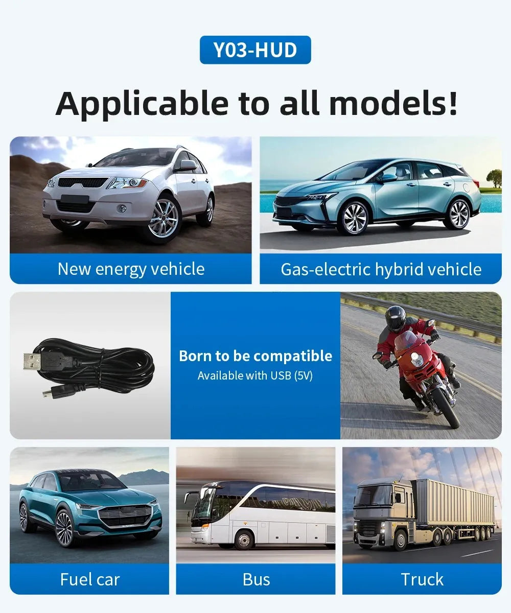 El velocímetro HUD digital universal proyecta la velocidad en tiempo real mediante señal GPS + Beidou, ofreciendo lectura clara y segura tanto de día como de noche. Compatible con autos, buses, camiones, bicicletas y scooters.