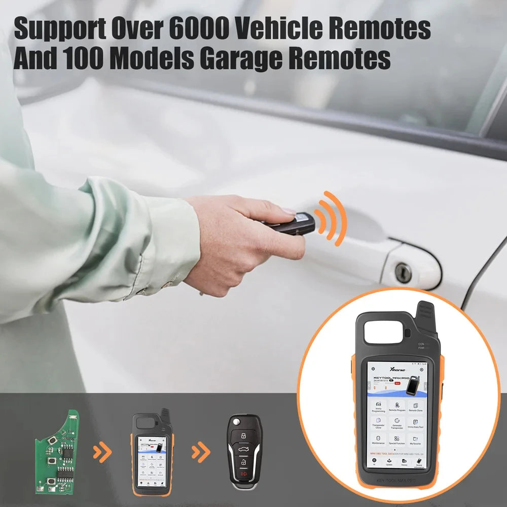 Combina las funciones del Key Tool Max y el Mini OBD Tool en una sola unidad con módulo OBD integrado, compatibilidad CAN FD, conexión Bluetooth + WiFi y soporte para programación de llaves, diagnóstico IMMO, mantenimiento y control de máquinas cortadoras Xhorse.