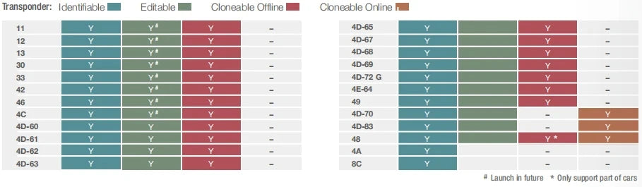 🔧 Generación, copia y edición de transponders (ID48, ID46, ID4D, ID4E, 7935, 8C, etc.).